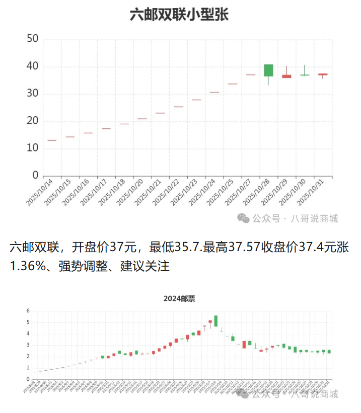 六邮双联,开盘价37元,最低35.7.最高37.57收盘价37.4元涨1.36%、强势调整、建议关注