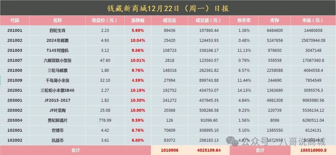 🌈钱藏新商城“王者归来”🔥周六天写的一篇文“钱藏盛宴已经强势来袭”,粉丝留言之多,多空争论之激烈,远超出本人之想象。“十年一遇的邮币卡”商城模式,笔者是判断狂欢盛宴是即将席卷每一个邮币卡人,可不代表任何商城的现模式都存在商机。得擦亮眼睛去抉择:哪些商城基本面没问题,团购方积极造市,流动性更好的。流动性越好,买卖差价越小,变现越容易、越快、成本越低;反之则越难。🔥一个成熟的投资者,一定要正视自己的欲望和失败,客观评价事物,而非一味地寻求心理安慰。邮币卡行业已经沉默了近十年,现在好不容易盼到有商城肯站出来做实事,广泛宣传邮币卡行业,引入更多的场外新会员入场,真实的让大家都能参与进来。🔥“事实胜于雄辩”,钱藏新商城四周以来的涨幅之大,流动性之好,真实成交之多,绝对是行业的典范。不认同者可以不参与,不参与者可以不赞美,但也不能过份去误导大家追求你认同的那缕“白月光”。❤️免责声明:本文仅代表个人思路,不构成任何投资建议!👨🚒作者:平凡人2025年12月22号