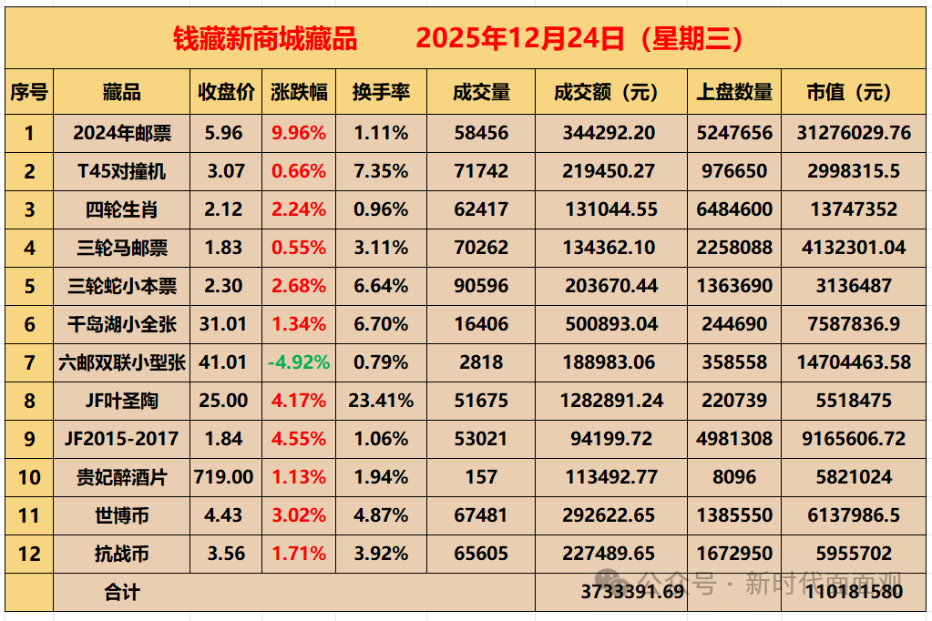 1.2024今天收盘首次站上3000万市值。自开盘以来,2024已上涨超十倍,近期连续走出四个涨停。今天早盘仅用两三分钟,2024封住涨停,封单约1.5万张,后被砸开涨停板。下午,可能是在散户小单的踊跃购买下,再次封住涨停。笔者猜测,2024的控盘度已经非常高,因为周围的朋友似乎手里越来越少了,该票近期人气最高,走势最强。2.调整或许结束。今日早盘其他个票有一定热度,随后冲高回落;下午,在千岛湖,JF叶等个票带领下,陆续翻红,个票价格基本回复到周一收盘附近,本轮调整或已结束。3.新开户福利来了。2025年12月25日至2026年1月31日期间新注册用户,充值≥1000元,且累计成交金额≥ 10000元;可领取价值50元抢购权礼包(每周统计一次并发放,活动期间注册的新用户仅限参与一次);符合条件的会员登录钱藏新商城-我的-我的福利-点击使用。