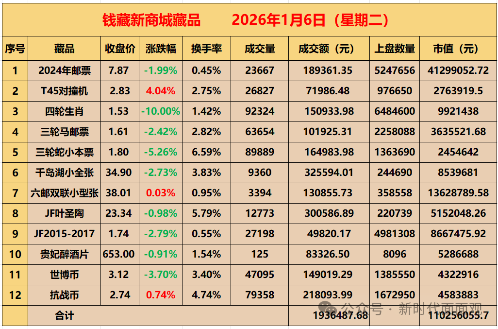 1月6日邮币商城行情速递 日期:2026-01-06 来源:新时代面面观 钱藏新商城: 1.2024今日继续缩量微跌。其他个票走势分化。 2.新开户福利来了。2025年12月25日至2026年1月31日期间新注册用户,充值≥1000元,且累计成交金额≥ 10000元;可领取价值50元抢购权礼包(每周统计一次并发放,活动期间注册的新用户仅限参与一次);符合条件的会员登录钱藏新商城-我的-我的福利-点击使用。 开户选择6699号段(开户链接附后)的朋友可以叠加获得30元现金红包。 华夏寄卖商城: 加速下跌。