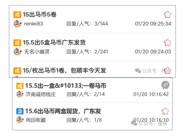 马年纪念币:一尘网卷币成交价在15-15.5 元,盒币价格更高,相比 10 元面值,首日涨幅就接近 50%。