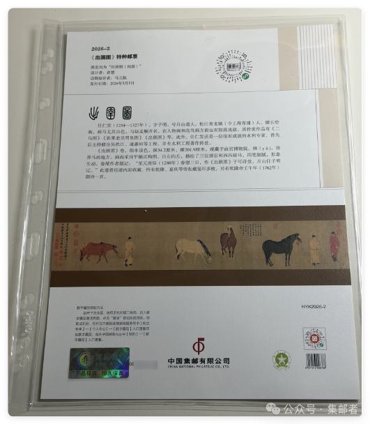 集邮者讯,今天小集收到了邮友友情送的一张《出圉图》护邮卡,说实话实物上手,一个PVC活页+一张卡纸,并没有惊艳的感觉。但玩数藏的外溢客群,确实对《出圉图》数藏有一定需求。虽然不能合成,4枚数藏邮票一套的话,只有5万套。对于不玩数藏的邮友,可以考虑留护邮卡,出掉数藏,目前数藏成交价在24-26元,还不用邮寄。