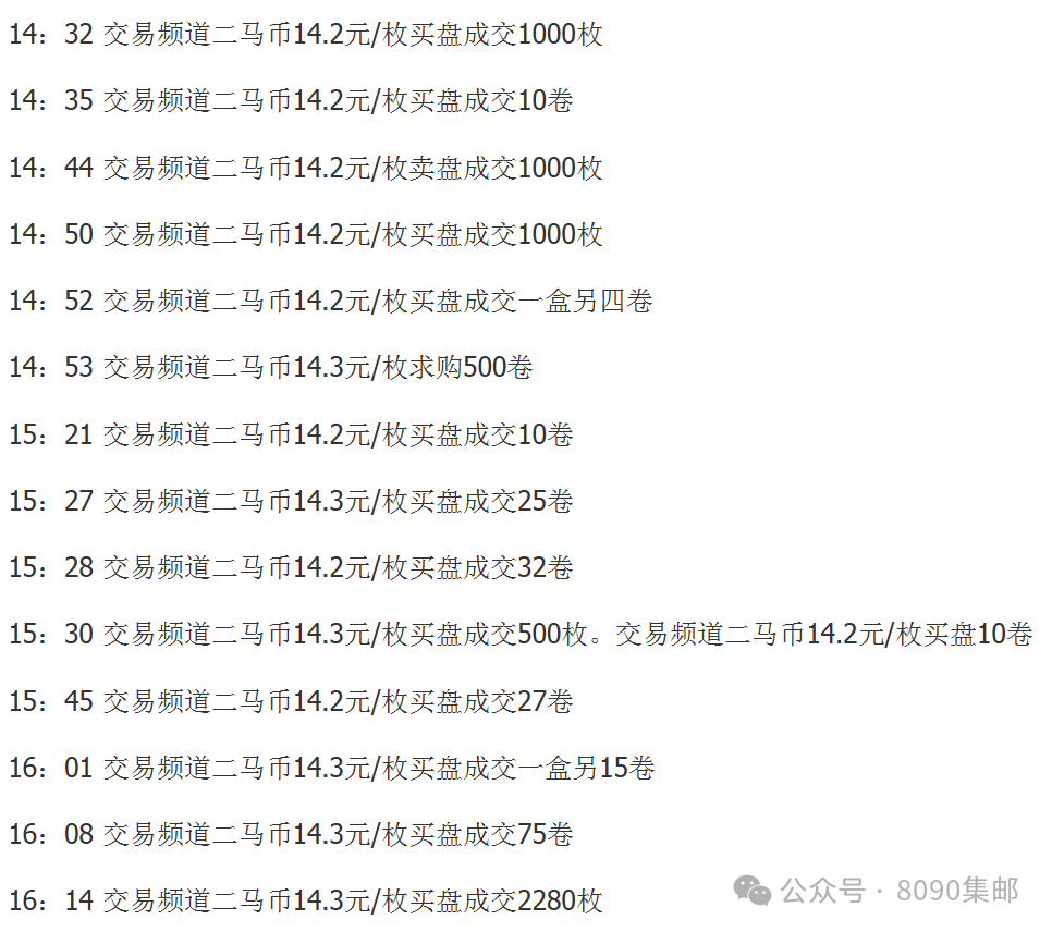 最近金银等贵金属价格上下翻飞,吸收了众多目光,在这种情况下,央行发行的“二马币”的大宗成交价格回升到14元/枚以上: