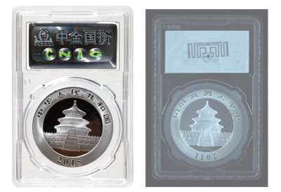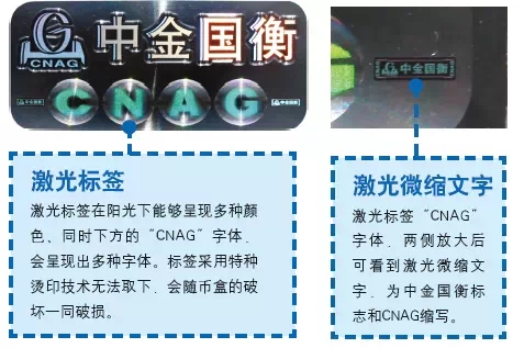 激光标签——评级币盒的背面有激光防伪标签,激光防伪标采用了光学微结构工艺,“CNAG”四个字母在各个角度均可见,且随着角度变化,“CNAG”四个字母呈现对称拉伸变形和旋转的效果。北京国际钱币博览会银币的激光防伪标签也采用了同样的防伪手段。激光防伪标签下部的左右制作了缩微的中金国衡LOGO及文字,其中,在40倍放大镜下,可清晰看到“中金国衡”字样,在90倍放大镜下,可清晰看到“CNAG”字样。