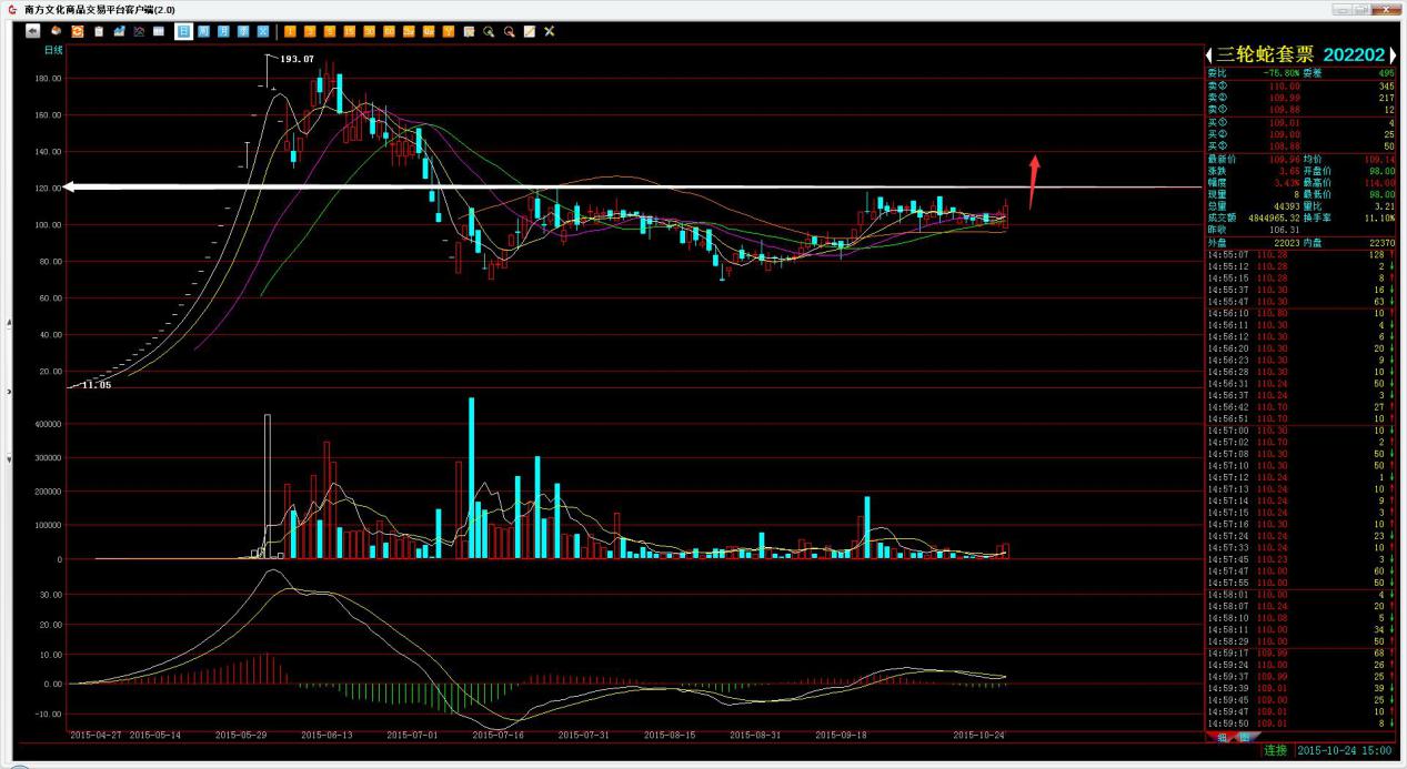 建议投资者关注三轮蛇套票,该品种今日企稳于100元一线,后市若能向上运行有冲击120元一线的潜力。