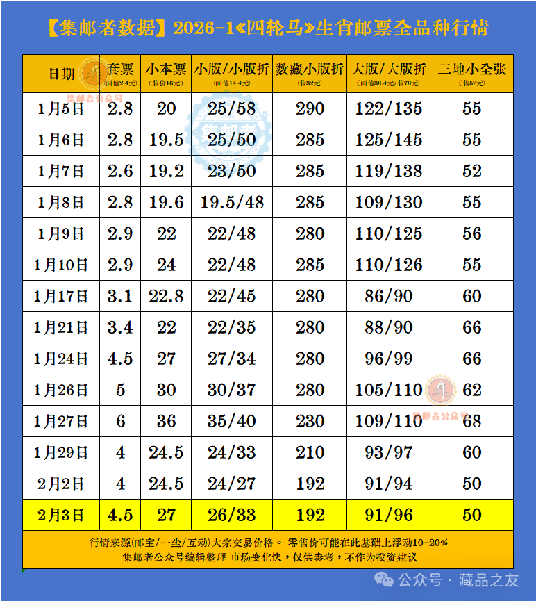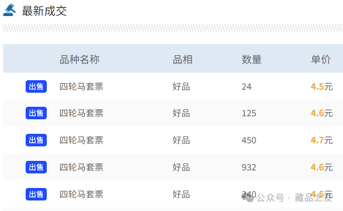 四轮马最新行情数据如下:点击下方卡片关注藏品之友