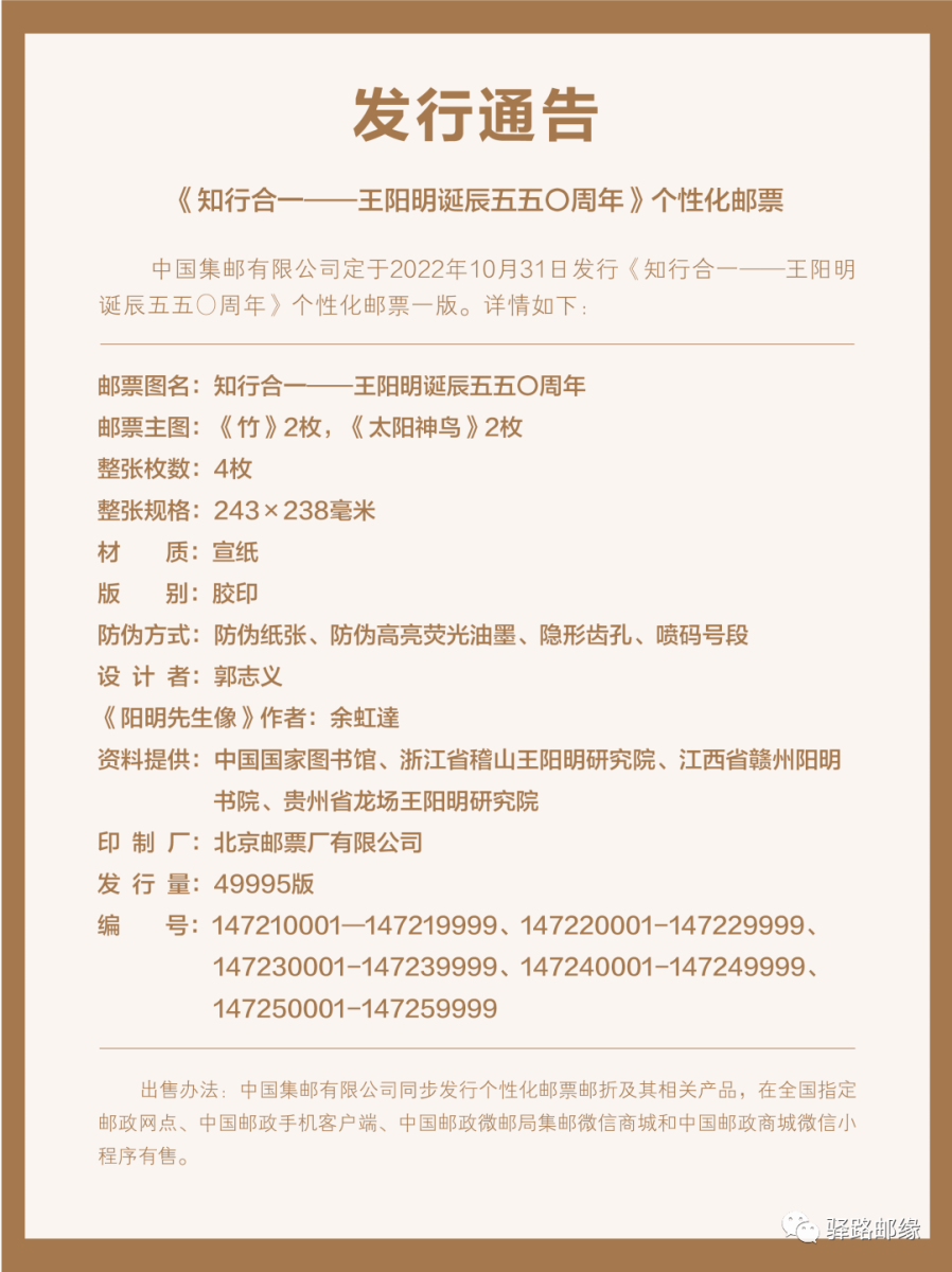 2022年适逢先贤王阳明诞辰五百五十周年。为延续先贤千年文脉,传承中华传统优秀文化,中国集邮有限公司定于10月31日发行《知行合一——王阳明诞辰五五〇周年》个性化邮票一版。