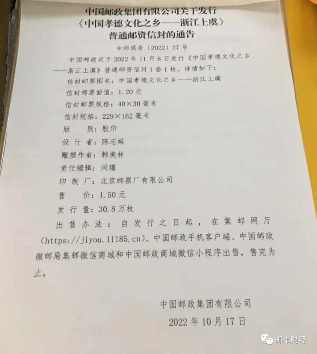 中国邮政将在11月8日发行《中国孝德文化之乡——浙江上虞》普通邮资信封的通告: