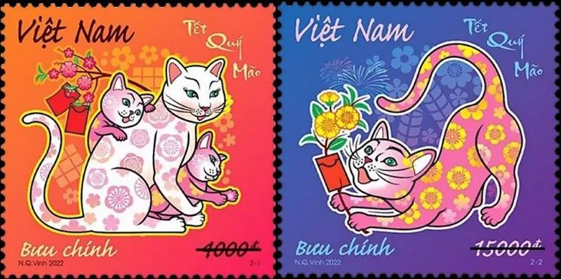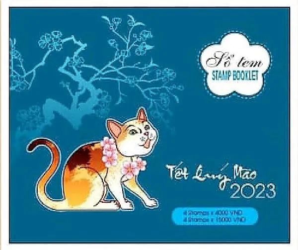 为了迎接2023年“猫年”来临,越南邮政于2022年12月1日发行《猫年》生肖邮票一套两枚及小型张一枚。邮票图案分别是两只小猫依偎在一只母猫身上和一只举着年花的公猫,将两枚邮票摆放在一起,就构成一幅公猫向母猫献花、给小猫“派利是”(发红包)的完整画面。小型张外型为正菱形,其中的邮票图案描绘猫夫妻与猫宝宝一家四口“全家福”的温馨场面,边纸图案则是挂着“利是封”(过年红包)的桃花及飞翔的燕子。邮票及小型张上印有越南文“猫年”字样,另有无齿票、无齿小型张面世。同时推出的还有一套小本票,内含两种邮票各4枚。