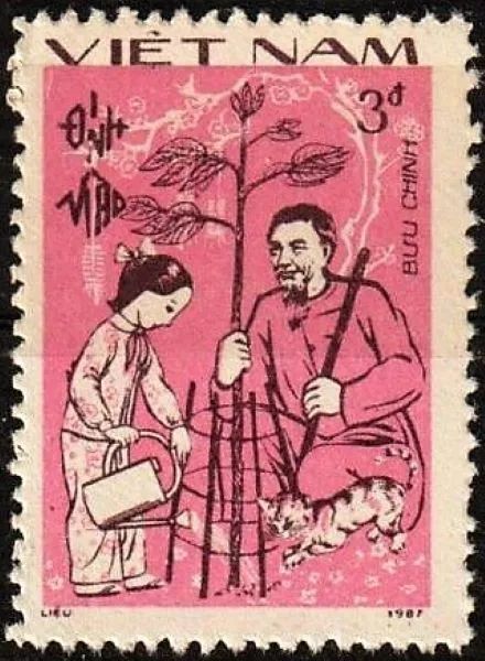 越南第一枚《猫年》生肖邮票于1987年1月6日发行,图案展现一位老者与一位女孩种树、浇水的场景,右下角可见一只小花猫,只是个不起眼的配角。因当时该国的生肖邮票尚未形成系列(越南的生肖邮票从1993年发行《鸡年》邮票开始形成系列),故邮票上的猫并不突出,也未标明“猫年”字样。