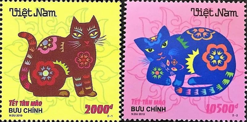 越南在2010年12月1日第三次发行《猫年》生肖邮票一套两枚,图案采用剪纸风格设计,分别表现一只站立的猫和一只躺卧的猫,票中印有越南文“猫年”字样。同时面世的也有无齿票。