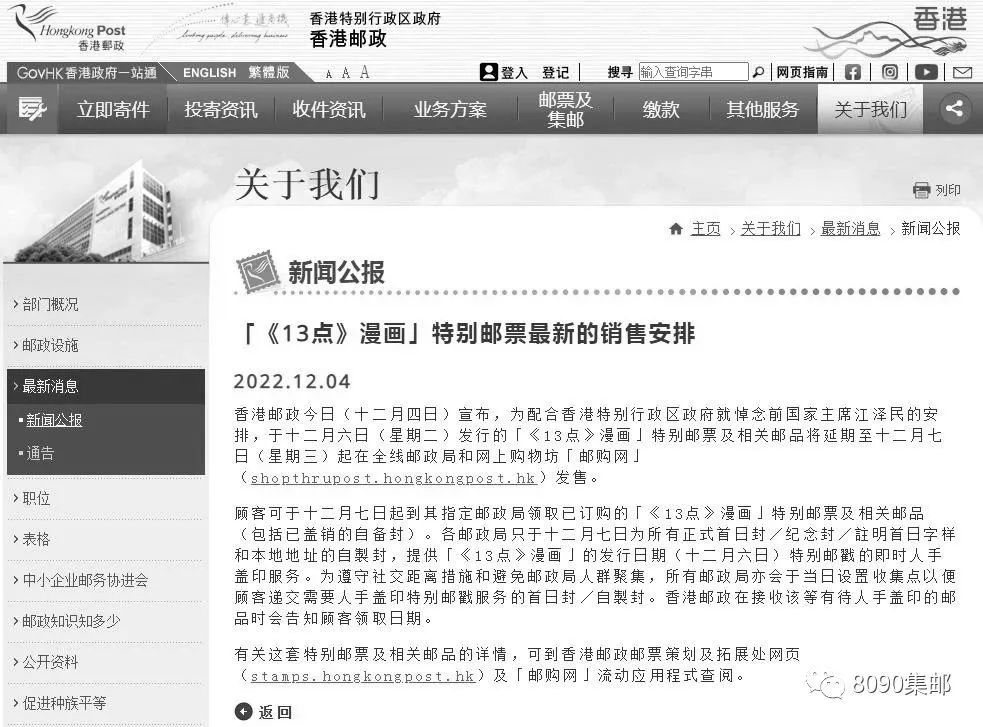12月4日,中国香港邮政正式发布公告,原计划将在12月6日发行“13点”邮票,将延期发行: