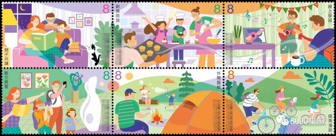 邮票面值均为8元新台币,依次描绘了“亲子共读”“欢乐烘焙”“线上学乐”“艺文展览”“休闲露营”与“铁马漫游”,邮票图案以缤纷多彩的色彩呈现,采用连印六枚连印,传达休闲活动带给人们愉悦美好的心情。