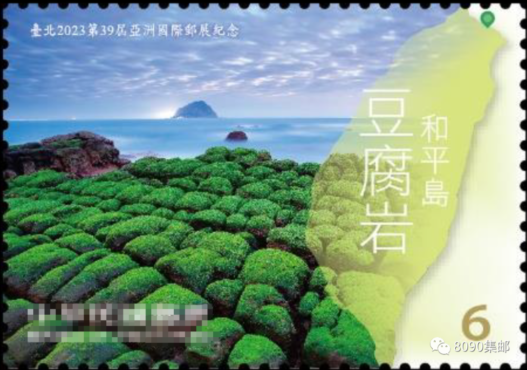 面值6元新台币邮票图案为“和平岛豆腐岩”,其位于北海岸风景区和平公园阿拉宝湾,海岸线旁的岩层因长期受海蚀及风化影响,形成豆腐岩特殊自然景观,冬春之际豆腐岩会长满绿藻呈现不同风貌。