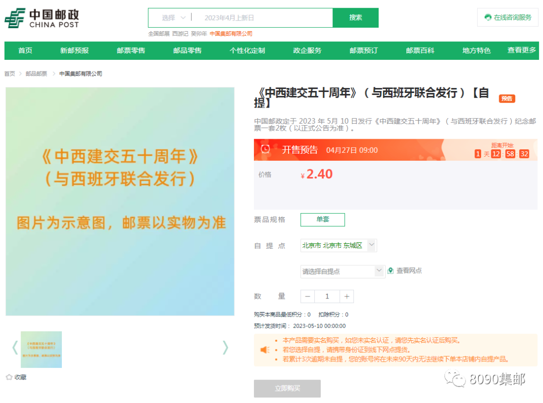 增发《中西建交五十周年》邮票【自提】时间确定,将在4月27日开售