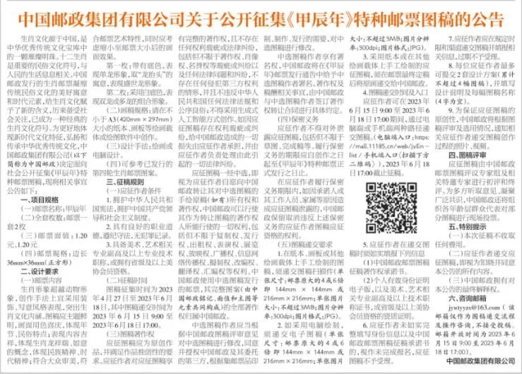 中国邮政集团有限公司关于公开征集《甲辰年》特种邮票图稿的公告
