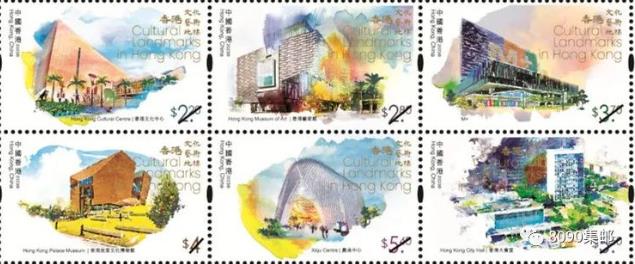 邮票依次展现的是香港文化中心、香港艺术馆、M+、香港故宫文化博物馆、戏曲中心和香港大会堂。