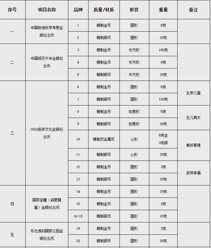 中国人民银行公布2024年贵金属纪念币项目发行计划