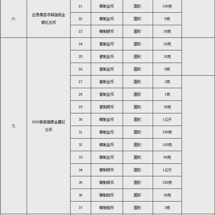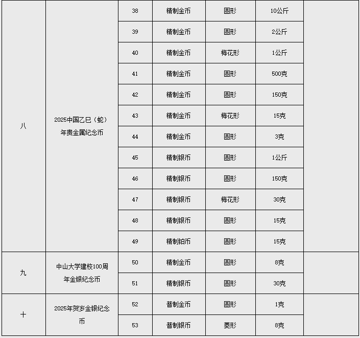 10个项目包括:中国极地科学考察金银纪念币、中国纸币千年金银纪念币、2024吉祥文化金银纪念币、国家宝藏(启蒙奠基)金银纪念币、东北虎豹国家公园金银纪念币、应县佛宫寺释迦塔金银纪念币、2025版熊猫贵金属纪念币、2025中国乙巳(蛇)年贵金属纪念币、中山大学建校100周年金银纪念币、2025年贺岁金银纪念币。