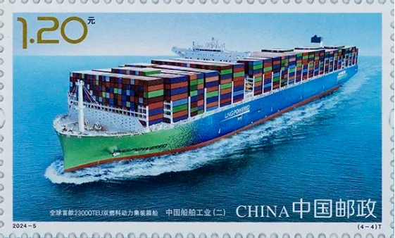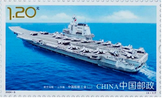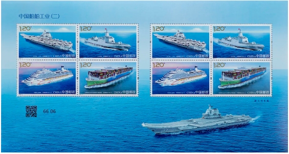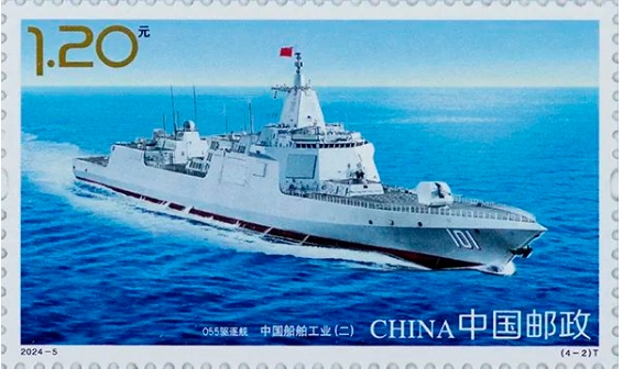 中国邮政定于2024年4月23日发行《中国船舶工业(二)》特种邮票1套4枚,邮票图案名称分别为:航空母舰——山东舰;055驱逐舰;中国首制大型邮轮;全球首款 23000TEU双燃料动力集装箱船。全套邮票面值4.80元。邮票计划发行数量为套票740万套、版式二90万版。