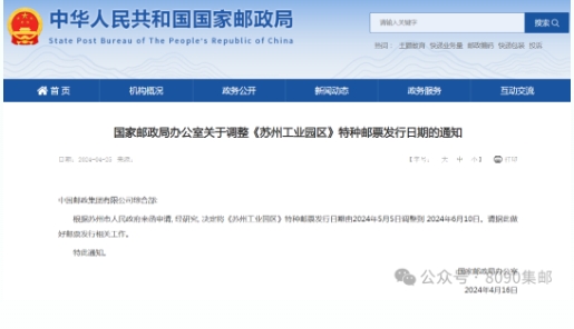 《苏州工业园区》邮票推迟公告发布 日期:2024-04-26 中国邮政将原计划将在5月5日发行《苏州工业园区》邮票一套一枚,但因配合相应活动,该邮票发行时间被推迟。 现在国家邮政正式公告这套邮票的延迟发行消息: 中国邮政定于2024年5月5日发行《苏州工业园区》特种邮票一套1枚: 因为种种原因,国家邮政局正式公布该套邮票延迟发行消息: