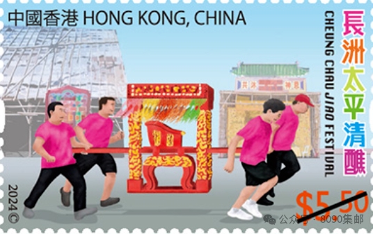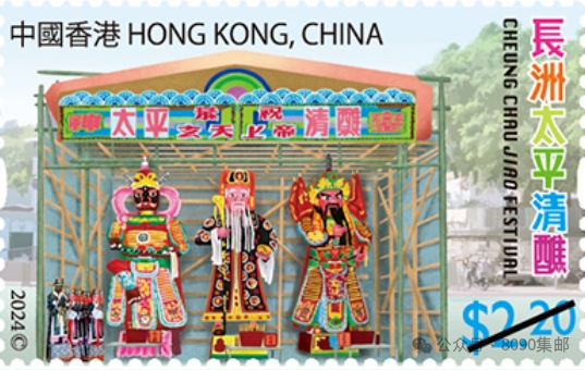 邮票上绘画了长洲太平清醮期间搭建的神棚,内里摆放了三尊纸扎神像。「建醮」展现了传统民俗的祭祀仪式及民间习俗,既答谢神明的庇护之恩,并祈求风调雨顺。