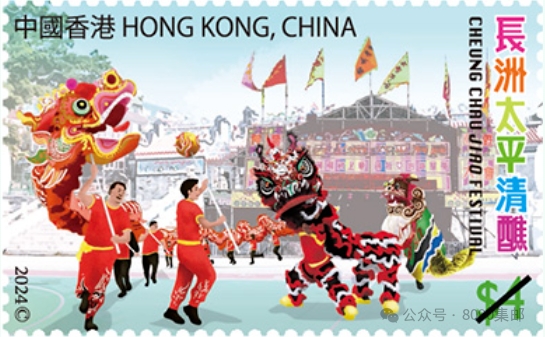 邮票上展现了醒狮和舞麒麟的热闹场面。正醮日下午举行的飘色会景巡游,各街坊及团体会派出飘色、醒狮、麒麟、乐队等合共十多支队伍,沿市中心的主要街道巡行,让两旁观众欣赏。当中巡游队伍包括有舞狮和舞麒麟,为太平清醮助兴及增添气氛。