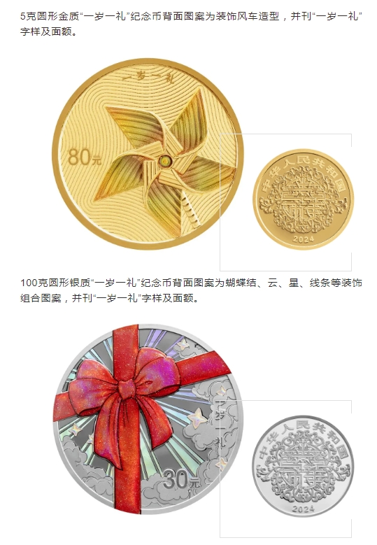 “一岁一礼”系列,以5克圆形金币和100克圆形银币为主打,寓意着时间的流转与生命的成长;