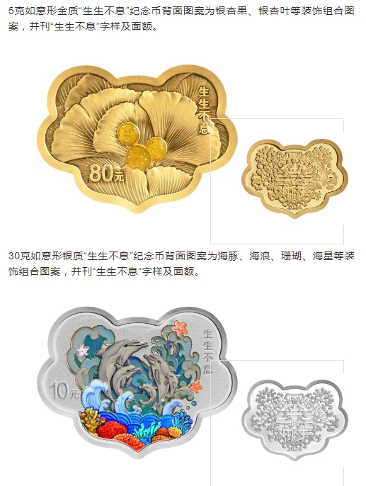 “生生不息”系列,则以5克如意形金币和30克如意形银币为特色,象征着生命的绵延与不断;