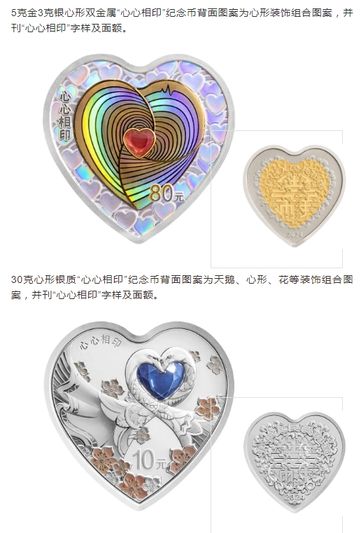 “心心相印”系列,则以5克金3克银心形双金属币和30克心形银币为亮点,展现了人与人之间深厚的情感纽带;