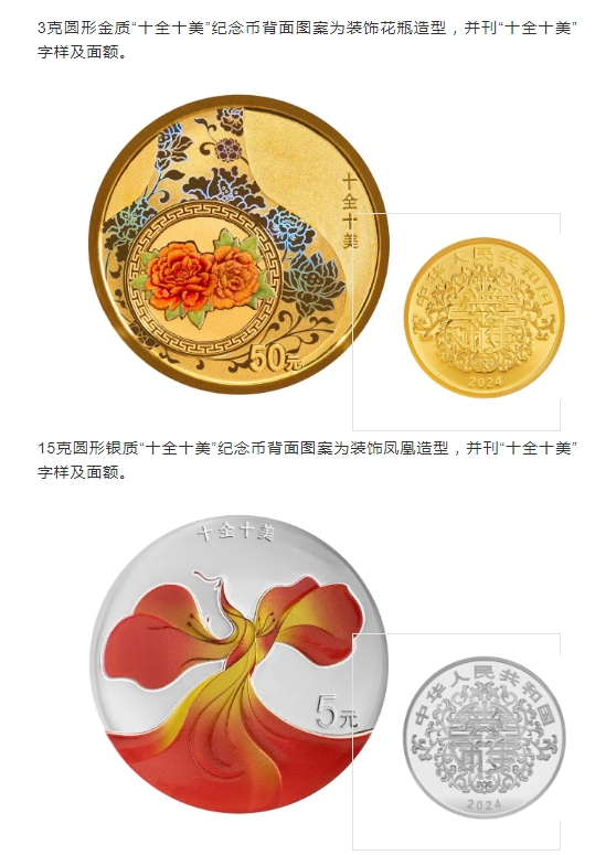 “十全十美”系列,则以3克圆形金币和15克圆形银币为代表,寄托了对生活美好的祝愿。