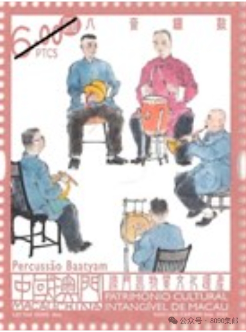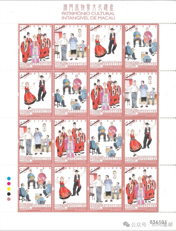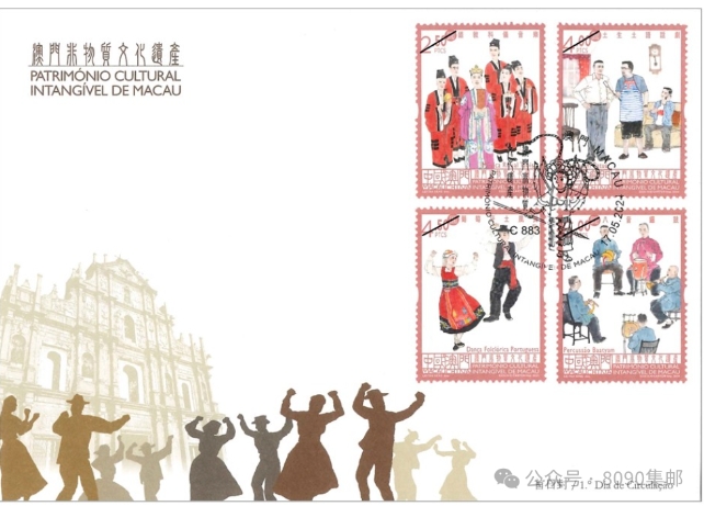是次发行的一套四枚邮票选取了四项不同的表演艺术类项目作为邮票的主题,分别是2011年及2021年列入《国家级非物质文化遗产代表性项目名录》的“道教科仪音乐”及“土生土语话剧”;以及2020年列入《澳门非物质文化遗产清单》的“葡萄牙土风舞”及“八音锣鼓”。图案呈现出每项表演的特质,同时彰显中西文化的和谐共融。