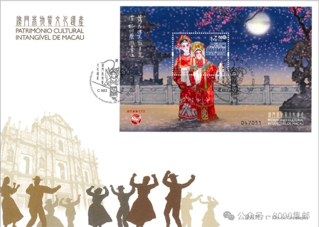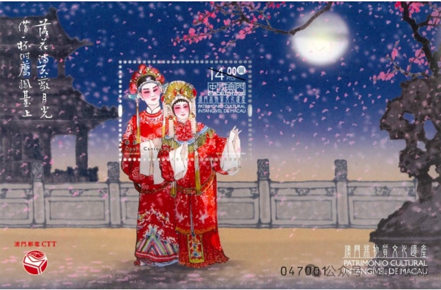 小型张则采用粤港澳共同申报并于2009年列入联合国教科文组织《人类非物质文化遗产代表作名录》的表演艺术类项目“粤剧”,以大众熟悉的《帝女花・香夭》剧目作为设计主题。“落花满天蔽月光,借一杯附荐凤台上” 的唱词,脍炙人口,情景交融。家喻户晓的精华场景,透过细腻的设计巧思跃然纸上。
