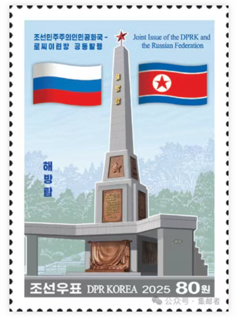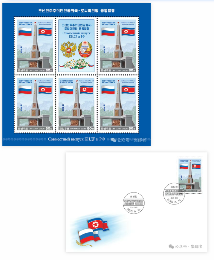 朝鲜8月15日将与俄罗斯联合发行一套新邮! 日期:2025-08-14 来源:集邮 集藏圈快讯 集邮者讯,值此朝鲜解放80周年之际,朝鲜民主主义人民共和国同俄罗斯联邦联合发行了邮票。 邮票资料 发行日期:2025年8月15日邮票规格:30×42mm 面 值:80圆设 计 者:赵元南、江哲友版 别:胶印 整版形式:3×2(5枚邮票+1个附票) 发行量: 有齿邮票:4000版(20000枚) 无齿邮票:400版(2000枚)首日封发行量: 600枚