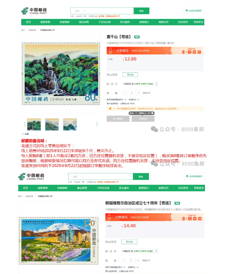山其中《莫干山》邮票的版式一,一版八枚与之前邮票零售时,一个账户可购买八套相契合,所以很多小伙伴都好奇,这次是否可以整版兑付。随着邮票发行时间临近,集邮网厅把这两套邮票【寄递】销售页面上线,算是揭晓这个答案:可以看到官方态度是这两套邮票,假如购买够数的话,均是可以整版兑付。但不排除地方网点执行时,要避免员工脑血栓,开始大面积撕版。