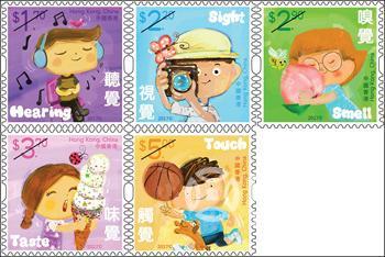 人体的五种感官让我们认识周遭的世界。这一套五枚色彩缤纷的邮票分别展示听觉、视觉、嗅觉、味觉及触觉五种感官,最能满足小朋友的好奇心。