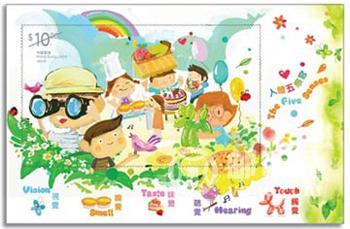 香港特别行政区邮政局定于7月18日发行《儿童邮票-人体五感官》邮票一套5枚,名称及面值分别为:听觉$1.70,视觉$2.20,嗅觉$2.90,味觉$3.70,触觉$5。以及小型张1枚、小版张1张、纪念套折(内含邮票小型张一套5枚)。