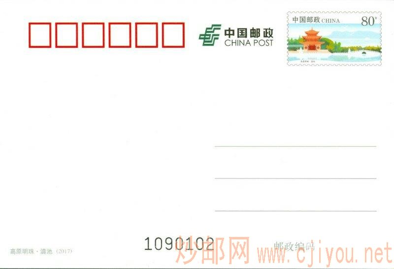 中国邮政定于2017年6月3日发行《高原明珠·滇池》普通邮资明信片1枚。明信片规格为148毫米×100毫米规格,明信片邮票面值80分。