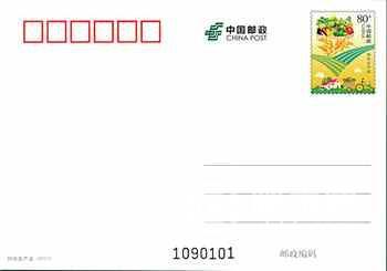邮资图选取农田农庄、绿色养殖、机械化收种以及农特产品为主要元素,整个画面主题突出,特色鲜明,展现了我国现代化农业及农产品的特征。