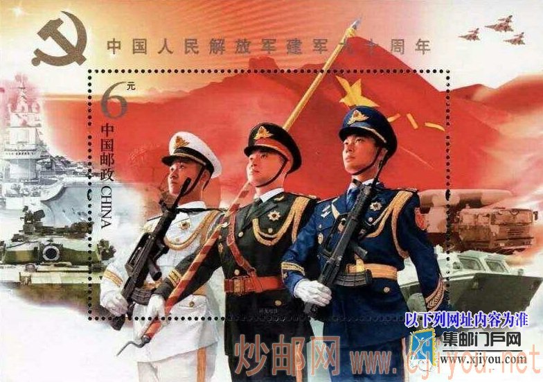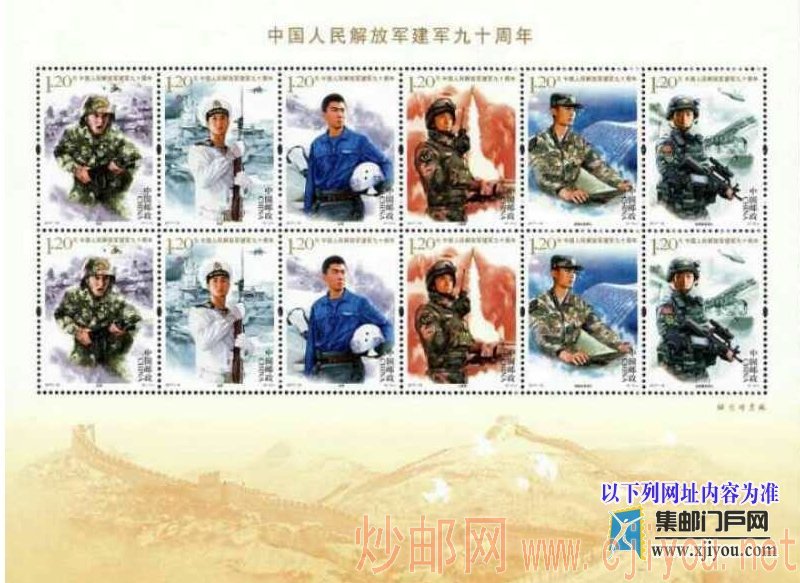 中国邮政定于2017年8月1日发行《中国人民解放军建军九十周年》纪念邮票1套6枚,小型张1枚。