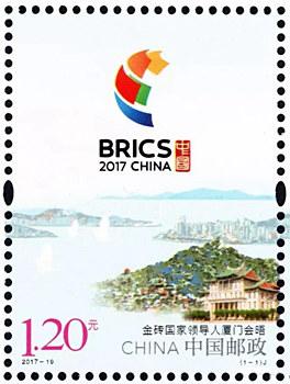 中国邮政定于2017年8月19日发行《金砖国家领导人厦门会晤》纪念邮票一套1枚。详情如下: