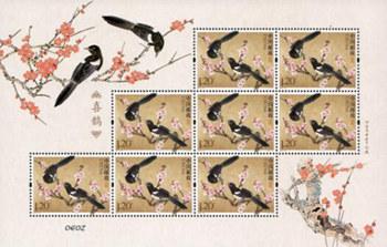 中国民间把喜鹊作为吉祥喜乐的象征,喜上眉梢、喜鹊登枝等成语均与喜鹊有关。该套邮票延续了《鸳鸯》与《相思鸟》的爱情主题,采用传统的中国工笔画法,精谨细腻地描绘出唯美的画面效果。画面中两只喜鹊在梅梢上一说一听、眉目传情,寓意相伴相栖、恩爱相守,结合一树凌寒而开的梅花,更有喜上眉梢之意;画面背景采用古朴温馨的仿古色调,整体画面雅致而不花哨、喜气而不张扬。