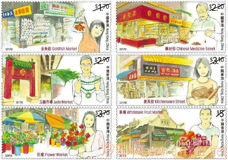 香港被誉为“购物天堂”,有很多不同主题的购物街。但今次是香港邮政首次将传统购物街“搬”上邮票。这套邮票包括旺角金鱼街和花墟、上环药材街、油麻地玉器市场、厨具街和果篮。一套六枚,面值1,7元至5元,将于下周二(19日)推出发售。