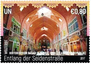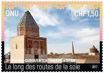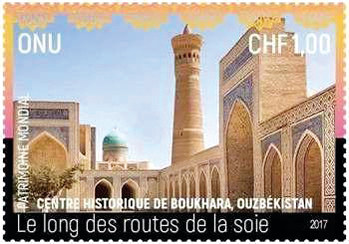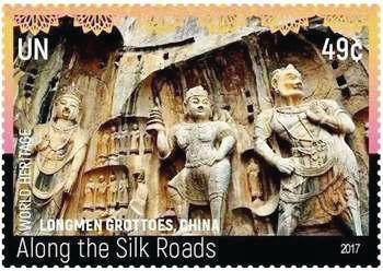 联合国邮政将于8月3日发行《丝绸之路》邮票一套6枚,其中联合国邮政管理局纽约办事处、日内瓦办事处和维也纳办事处各发行2枚邮票。 6枚邮票的图案分别为中国龙门石窟(面值0.49美元)、吉尔吉斯苏莱曼圣山(面值1.15美元)、乌兹别克斯坦布哈拉历史中心(面值1.00瑞士法郎)、土库曼斯坦库尼亚乌尔根奇(面值1.50瑞士法郎)、伊朗大不里士集市(面值0.80欧元)、土耳其番红花城(面值1.70欧元)。 | |||