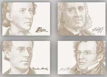《外国音乐家(二)》特种邮票全套4枚,各枚内容分别表现 《外国音乐家(二)》特种邮票全套4枚,各枚内容分别表现奥地利作曲家音乐家弗朗茨·舒伯特、匈牙利作曲家钢琴家指挥家弗朗茨·李斯特、波兰作曲家钢琴家弗里德里克·肖邦、奥地利作曲家及指挥家古斯塔夫·马勒四位外国音乐家。