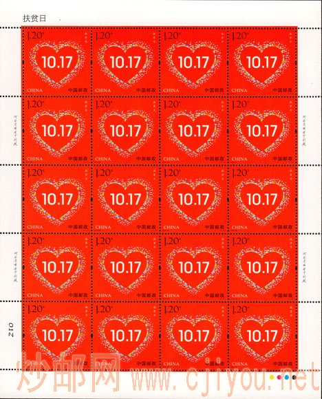《扶贫日》纪念邮票1套1枚 日期:2017-10-18 中国邮政定于2016年10月17日发行《扶贫日》纪念邮票1套1枚。详情如下: 志号:2016-30 图序:(1-1)J 图名:扶贫日 面值:1.20元 邮票规格:36×36毫米 齿孔度数:13.5×13度 整张枚数:20枚 整张规格:170×210毫米 版 别:胶印(采用局部烫印工艺) 防伪方式:防伪纸张 防伪油墨 异形齿孔 荧光喷码 设 计 者:何洁、周岳 责任编辑:李金薇 印 制 厂:河南省邮电印刷厂 [责任编辑:]