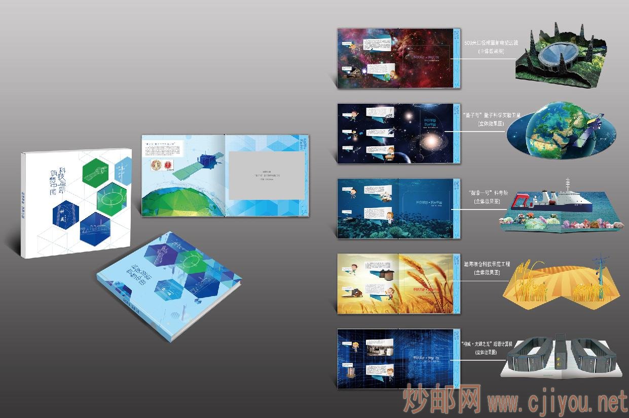 - 整版邮册采用手绘的方式,结合相关的科普知识及科技项目立体式的设计,同时,在科普小知识页面上,单独配有立体邮折,邮折封面和邮册底图相互融合,当打开邮折后,呈现给我们的将是工程立体图案,增强真实视觉体验,从而展示我国科技所取得的巨大成就。