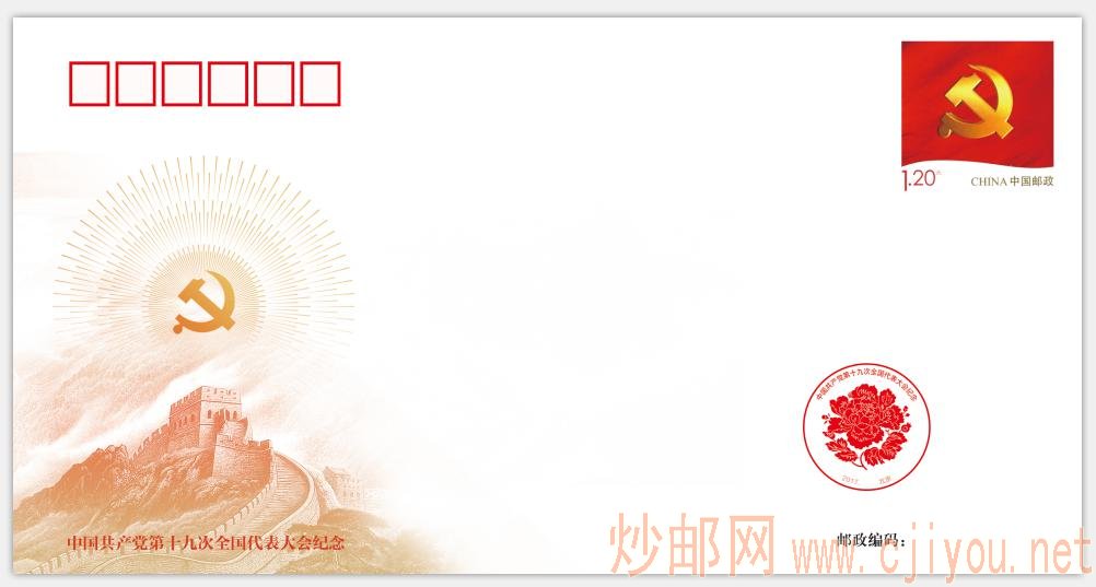 《中国共产党第十九次全国代表大会》纪念封 日期:2017-10-20 《中国共产党第十九次全国代表大会》纪念封 所属分类: 封 > 纪念封 售价: 3.5 发行日期: 2017-10-18 内容: PFTN编号纪念封一枚,封上贴党徽主图个性化邮票(无附图)。