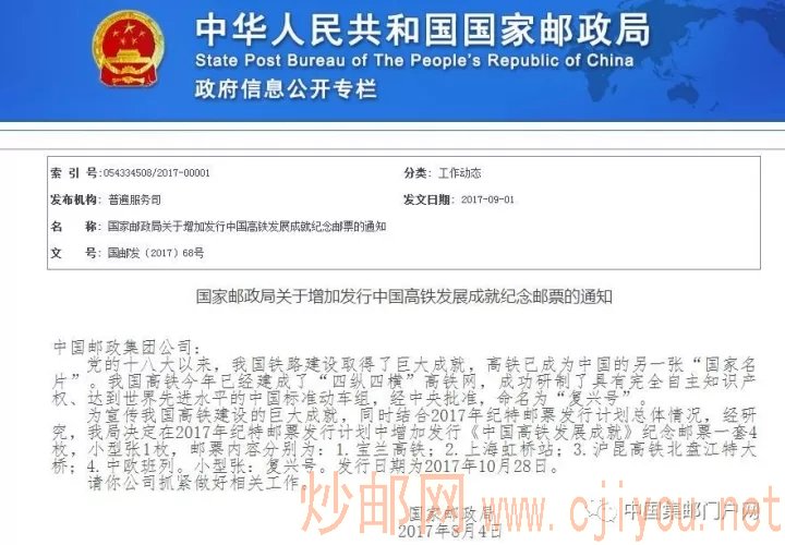 增发票《中国高铁》邮票、小型张发行时间基本确定 日期:2017-11-02 2017-11-02 中国集邮门户网 据总公司消息,国家邮政局要求增发的《中国高铁发展成就》邮票、小型张,据了解初步确定位2017年11月25日发行,中国集邮总公司将发行大版册。《锦鲤》邮票是否在今年内发行,请继续关注消息。