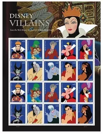 这套邮票中的十个迪士尼反派角色为:《睡美人》中的大反派梅尔菲森特(Maleficent),《木偶奇遇记》的诚实约翰、《101斑点狗》中的 Cruella De Vil、《彼得·潘》中的胡克船长,《爱丽丝梦游仙境》中的红心女王、《灰姑娘》中的继母特曼妮夫人、《小美人鱼》中的超级大反派Ursula、《白雪公主》中的皇后、《美女与野兽》中的加斯顿及《狮子王》中的刀疤(Scar)。
